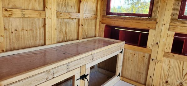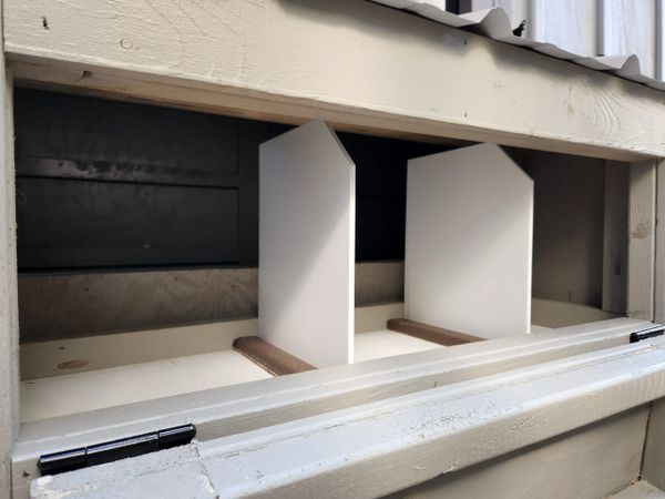 The coop provides three nesting spaces with removable dividers and a drop down door for easy egg collection.