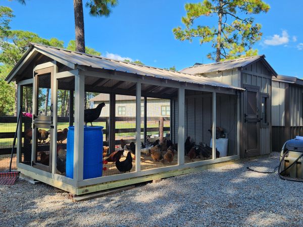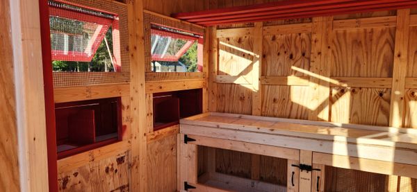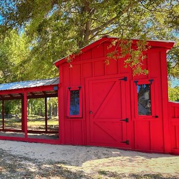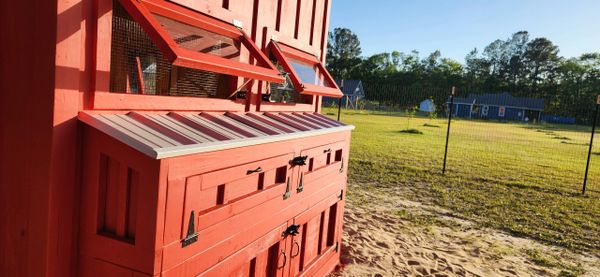 Inspired by North Carolina farm structures, our Luckenbawk Coops, 10ft at peak, offer spacious and versatile housing options for accommodating a large number of chickens. All of our Luckenbawks include custom board & batten, a 12ft, 16ft, or 24ft run, latching windows secured with black hardware cloth, a walk-in henhouse, attached eggbox, choice of Sherwin Williams paint or stain color, wooden chicken door and matching roosts. We also offer an add-on divided storage room side, which splits the henhouse in half.